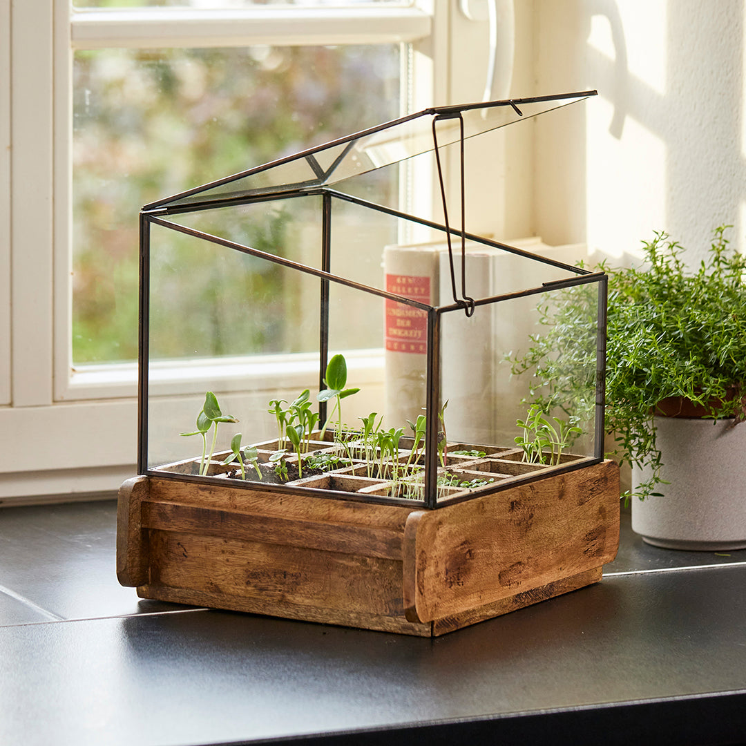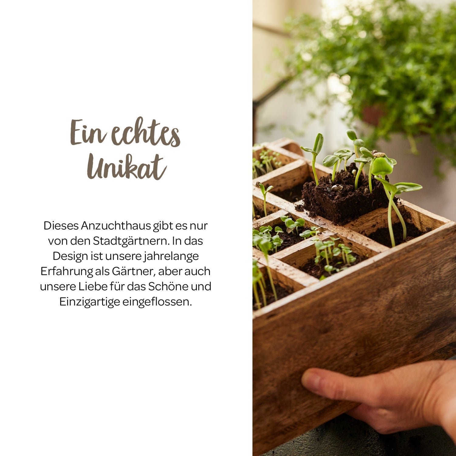 Dieses Anzuchthaus gibt es nur von den Stadtgärtnern. In das Design ist unsere jahrelange Erfahrung als Gärtner, aber auch unsere Liebe für das Schöne und Einzigartige eingeflossen. Es ist perfekt, um deine Jungpflanzen in einem dekorativen Rahmen zu kultivieren.