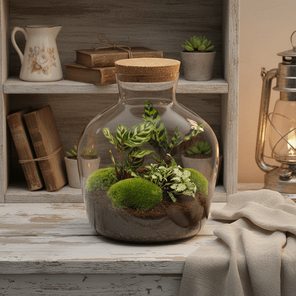 Dank des geschlossenen Ökosystems sorgt das Terrarium größtenteils selbst für Wasser und Luftfeuchtigkeit. Gießen ist oft nur ein- bis zweimal im Jahr erforderlich. So genießt du mühelos lebendiges Grün, ganz ohne Aufwand. Stelle das Terrarium ins Wohnzimmer, auf deinen Schreibtisch oder verschenke es; es bringt sofort Atmosphäre und ein Gefühl von Frische in jeden Raum. So kannst du zuhause oder im Büro sorgenfrei und endlos Grün genießen. Alle Vorteile, ohne die Mühe! Füge dieses Terrarium deinem Warenkorb hinzu und freue dich schon morgen über dein eigenes Mini-Ökosystem!