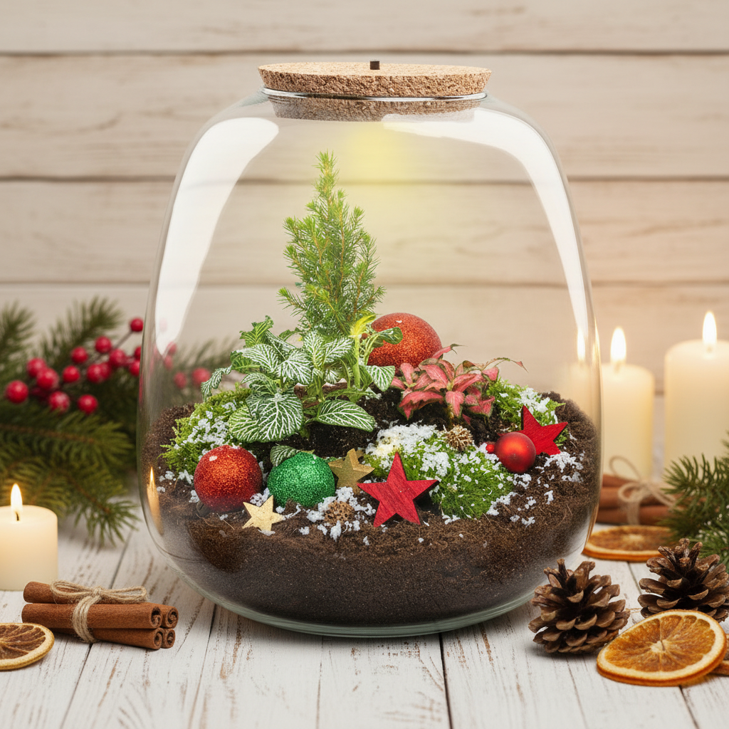 Mit einem Weihnachts-Terrarium holen Sie mehr in Ihr Zuhause oder Ihr „Weihnachts-Office“ als nur festliche Deko. Dieses sich selbst erhaltende Mini-Ökosystem, auch bekannt als Terrarium oder Flaschengarten, verbindet üppiges Grün mit gemütlichem Wintercharme – für eine zauberhafte Atmosphäre in der Feiertagszeit. Perfekt für alle, die Weihnachten und Natur lieben, aber wenig Aufwand möchten: Das Terrarium reguliert seine eigene Luftfeuchtigkeit und muss nur ein- oder zweimal pro Jahr gegossen werden.